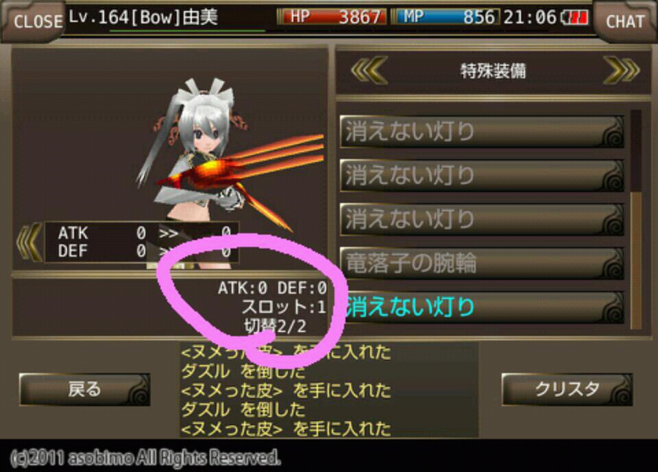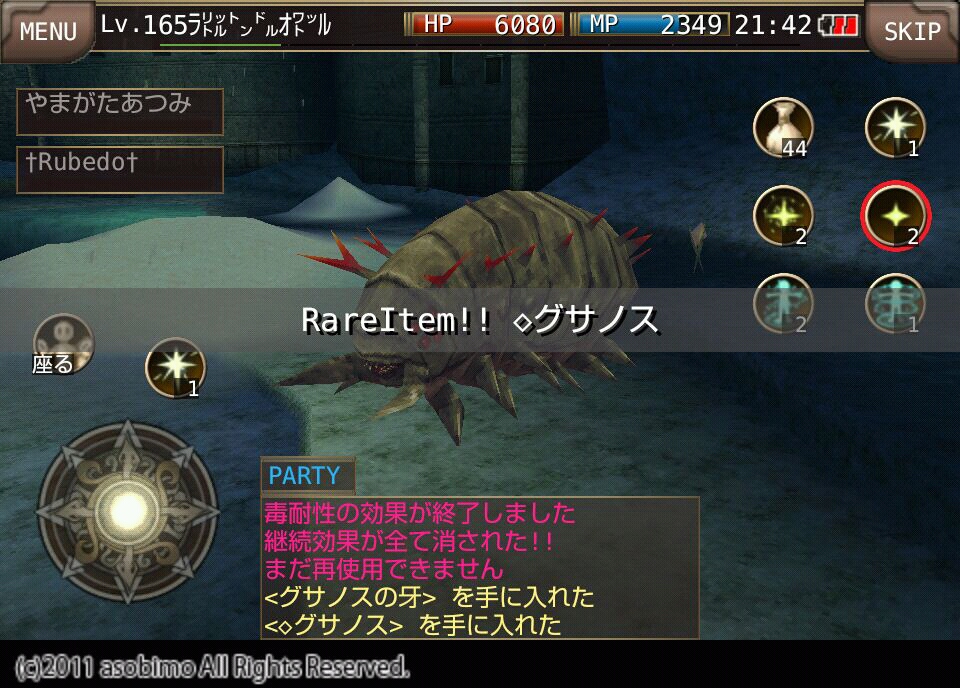 ダズルさんから発光エキスを手に入れるべく倒しまくってたら出ました♪ちなみに492体目(ヌメった皮の数カウント)♪